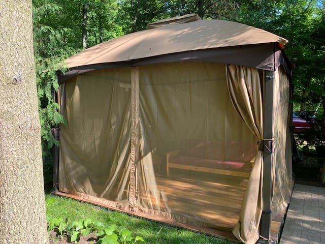 - Wooden structure shed, Metal storage shed, Gazebo and Fireplace